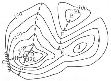 - 多条等高线重合的地方是陡崖(C);